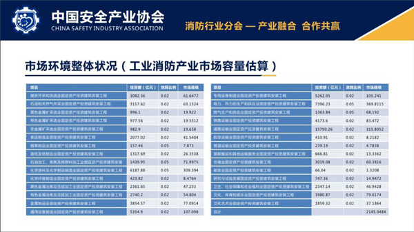 上面這張表比較詳細(xì)地統(tǒng)計(jì)了除民用消防之外的國民經(jīng)濟(jì)主要領(lǐng)域的消防市場容量。除此之外,2015年整個消防部隊(duì)的裝備市場容量應(yīng)該不低于132億元。把民用、工業(yè)以及裝備這塊的市場加起來,總共大概在4500億左右。
